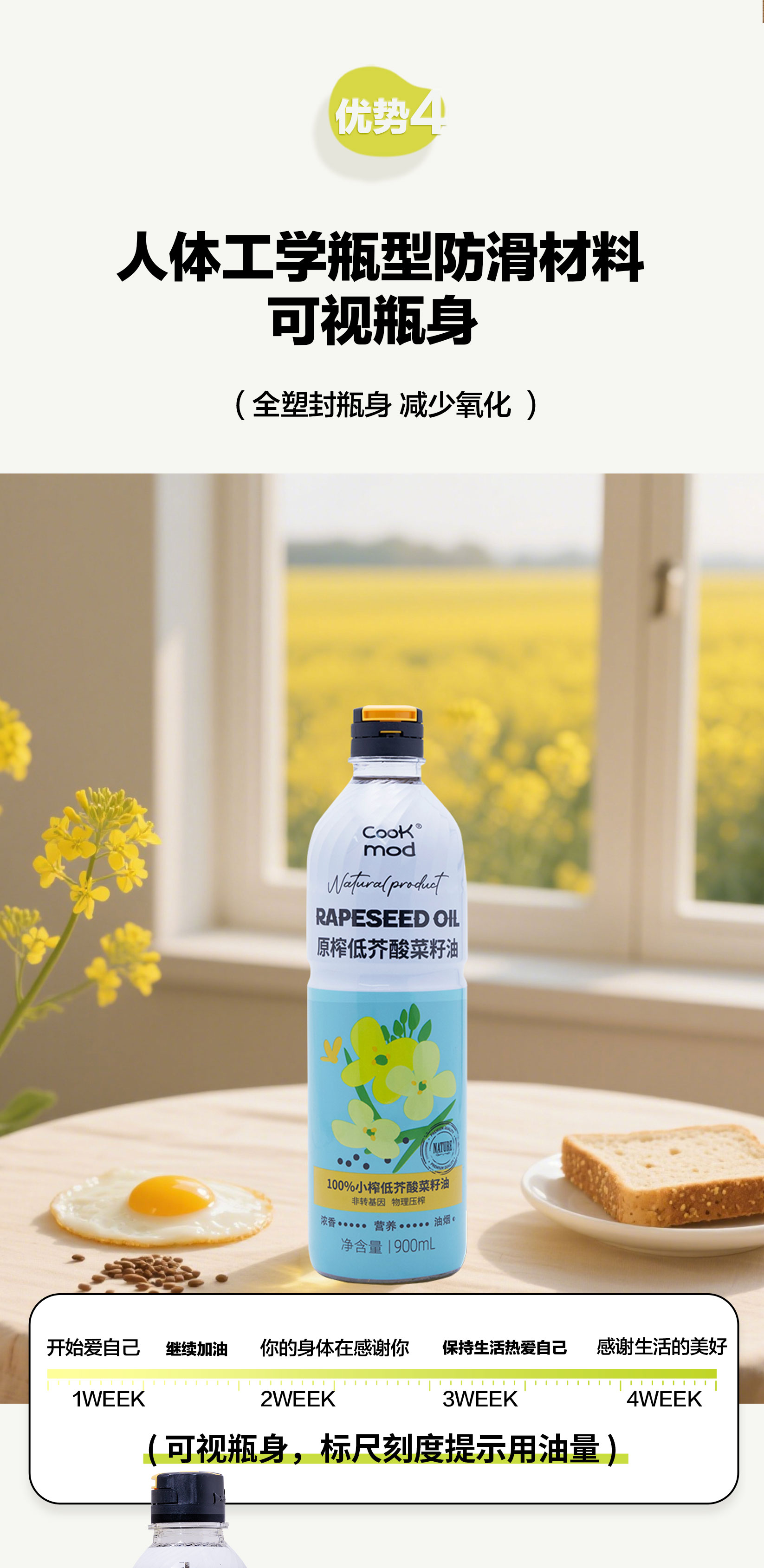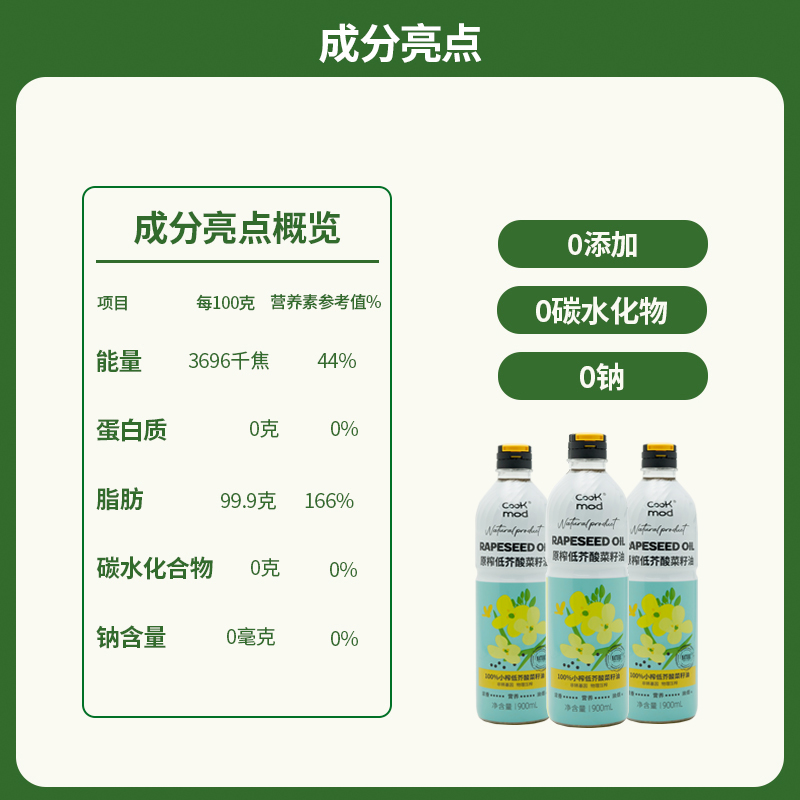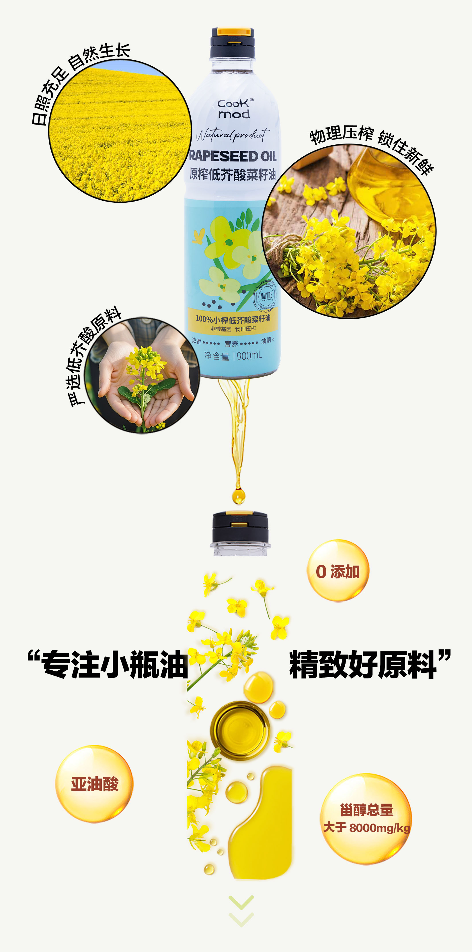 cookmod年轻厨房原榨低芥酸菜籽油900ml*3瓶装