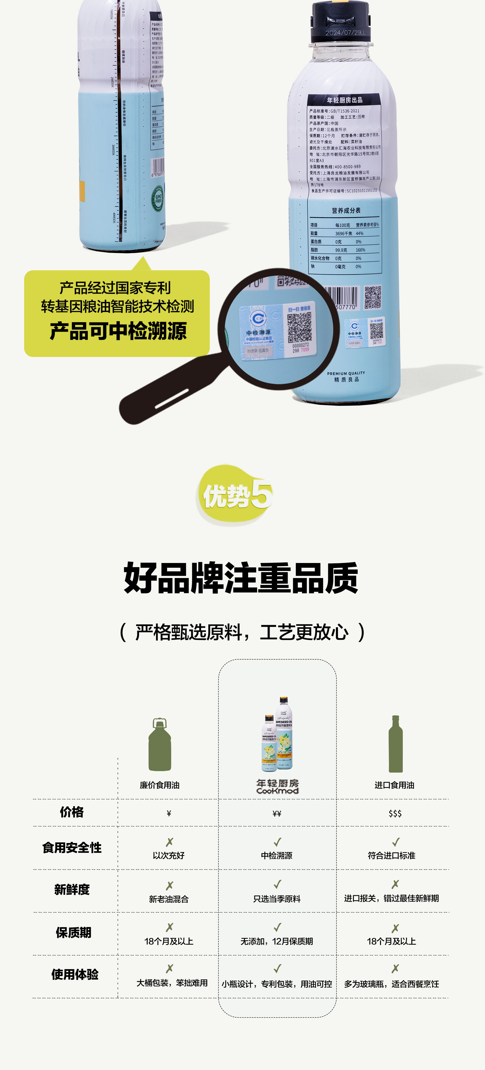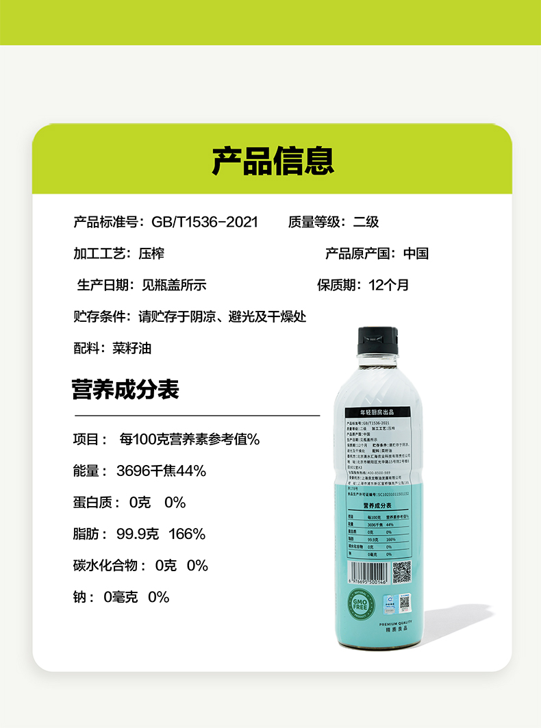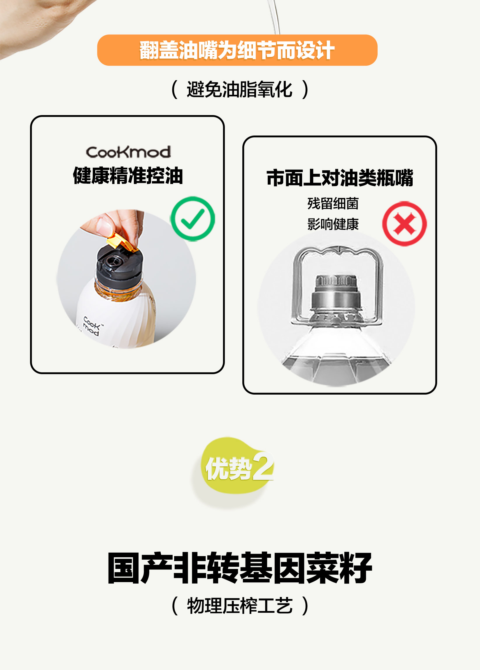 cookmod年轻厨房原榨低芥酸菜籽油900ml*3瓶装